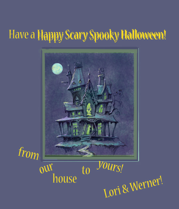 I have a ton of work from both school and studio, and yet sometimes it is just fun to play. So still in my robe this morning I decided to sketch out a doodle of a house, throw it into photoshop and see what happened. The result: this year’s Halloween card. Enjoy and have a great Hallowe’en wherever you frighteningly be!