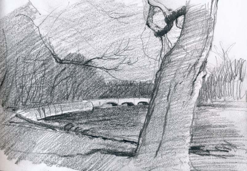 Today was one of the first warm spring days in a while. I took a break from marking and joined my wife and our dog Pippa to walk down to the river. While Lori strolled I hung behind to draw this massive old tree that still grows along the river. Something about this huge trunk that seems to twist and lean like a some old but still very strong old person always captivates me when I walk by. It’s probably over 100 years old and like many of the trees that once lined the river it may not be here long. I will miss it.