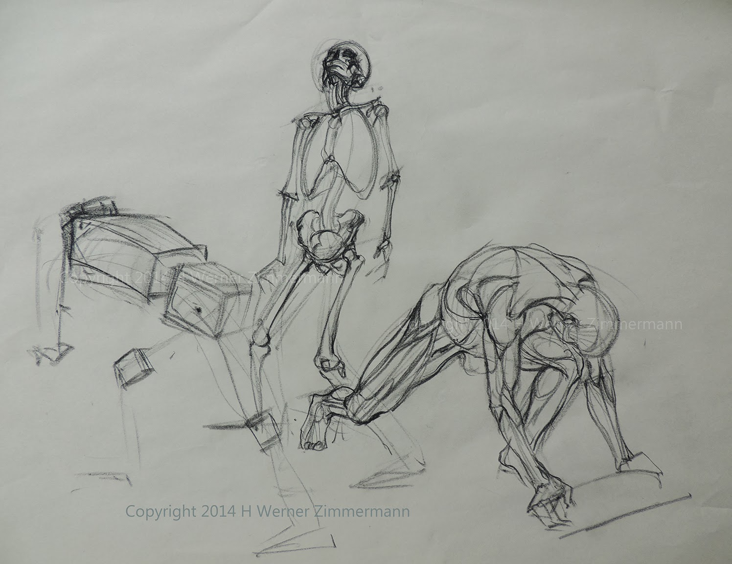 All that said, I came across this image of variations on three gestures. Each began with just some quick lines that reacted to the pose. From those lines I chose to explore the simple form of boxes, the nature of the skeleton within a pose, and finally a gesture developed into the muscular anatomy of the figure in that pose.